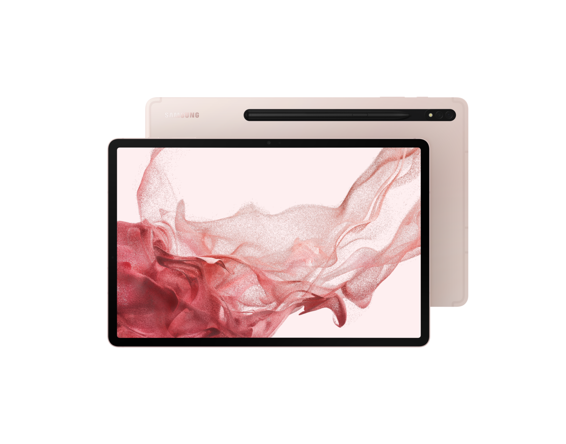 Galaxy Tab S8系列的深屿灰、冷霜银和浮光粉装甲铝框架。它们相继出现在画面中,并排在一起,彰显纤薄设计的耐用性。
