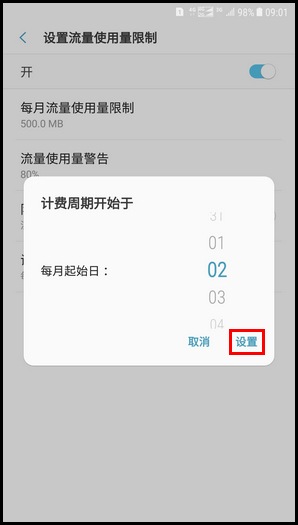 13.若想更改监测期的每月重置日期,点击【设置资费套餐开始日期】,设置使用流量计算起始日期后,点击【设置】即可。