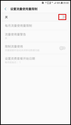 12.若想设置设备在流量超额时自动关闭移动数据功能,点亮【限制流量使用】右侧滑块开关开启该功能。