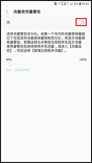 10.向右滑动【圆点】图标,可调整流量警告百分比。如果一个月内的流量使用量超过了您选定的流量使用量限制百分比,将显示流量使用量警告。