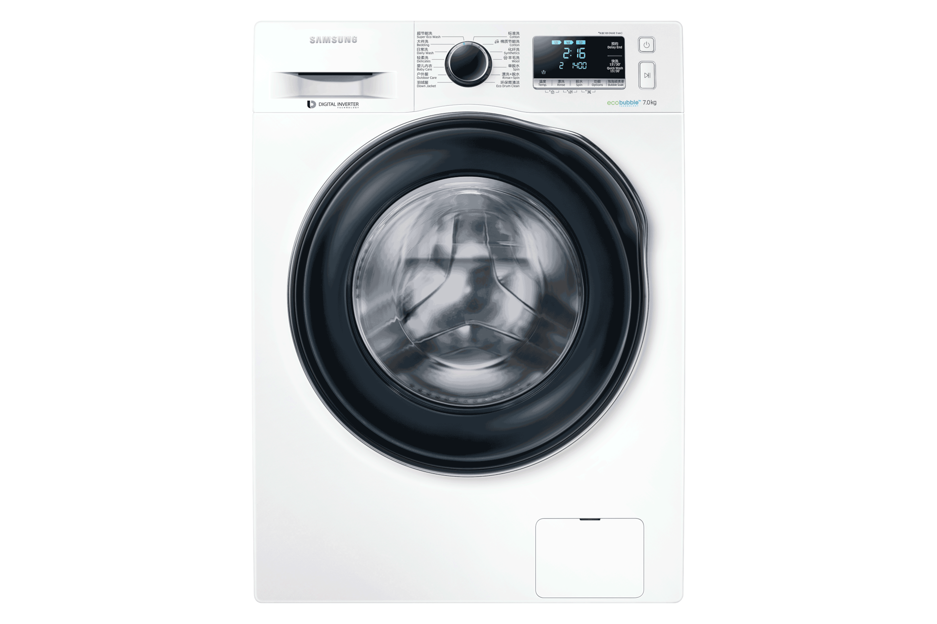 *此数据为三星内部检测;负载少于2公斤轻微弄脏衣物,最少约15分。取决于水压,水硬度及额外选项等条件;快洗时间:关>15>30;建议此程序洗涤剂量小于20克。