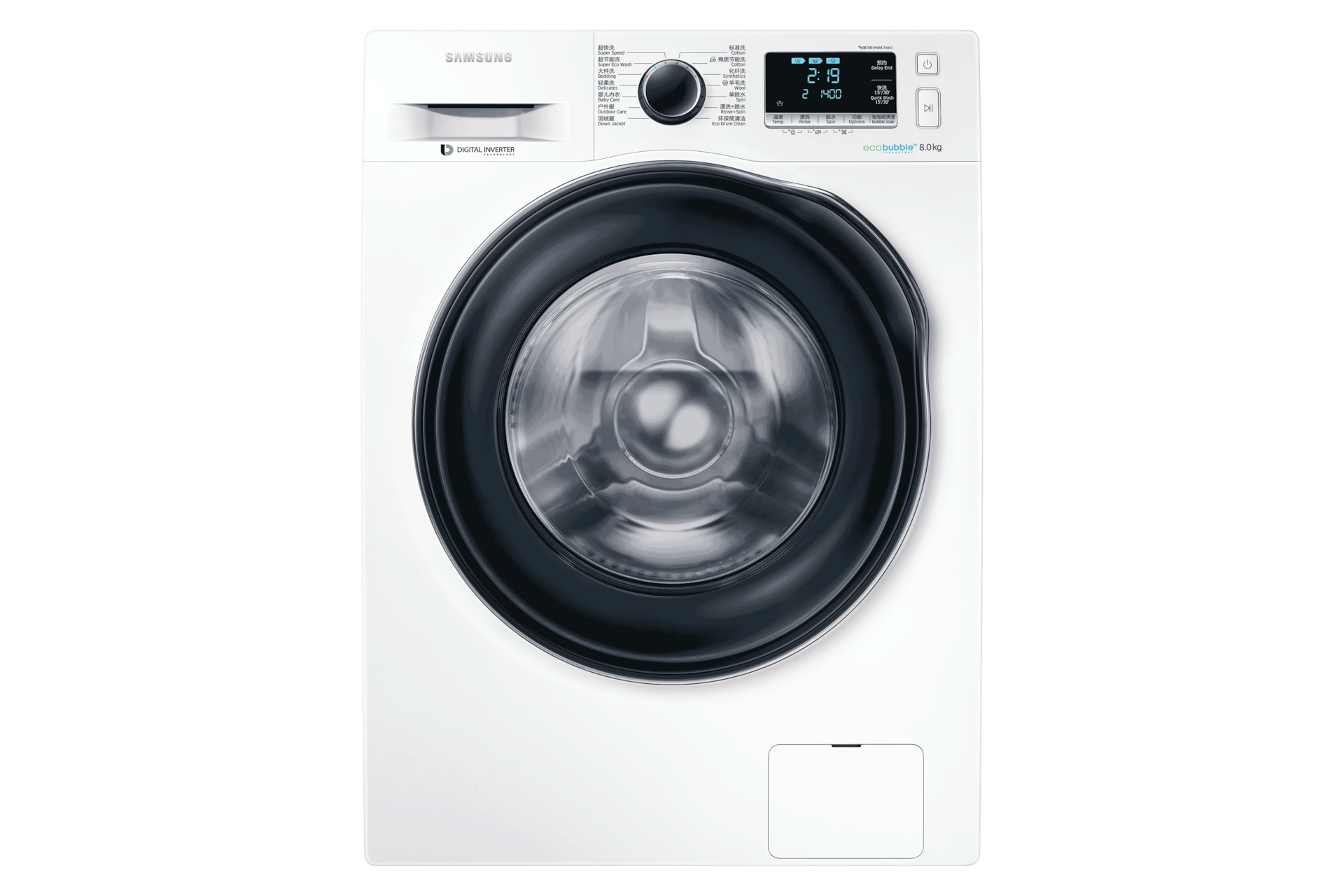*此数据为三星内部检测;负载少于2公斤轻微弄脏衣物,最少约15分。取决于水压,水硬度及额外选项等条件;快洗时间:关>15>30;建议此程序洗涤剂量小于20克。